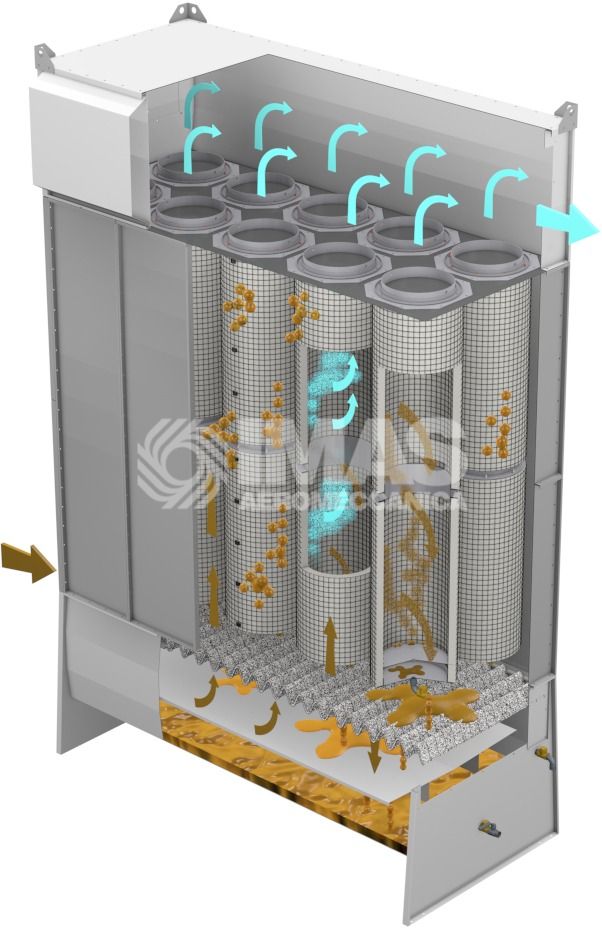 La filtration, basée sur le principe de la diffusion brownienne des particules ayant dimension inférieure au micron, garantit une efficience supérieur au 96-98%, et tout cela sans qu'aucune opération d'entretien ou de remplacement ne soit nécessaire. Lors du drainage la récolte de l'huile se fait dans le spécial bac intégré, d'où il sera évacué automatiquement par la soupape à Clapet. L'air ainsi dépuré passe par le ventilateur - qui est donc traversé par de l'air propre - et est envoyé vers le filtre final (HEPA H14 EN 1822 efficience 99,99%), qui sert aussi de diffuseur.
